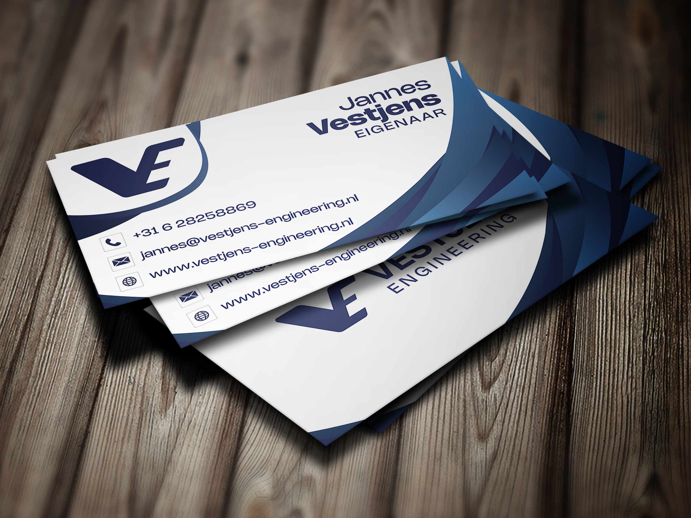De huisstijl werd doorvertaald naar visitekaartjes en briefpapier, zodat Vestjens Engineering met een consistente uitstraling naar buiten treedt, zowel digitaal als op papier.